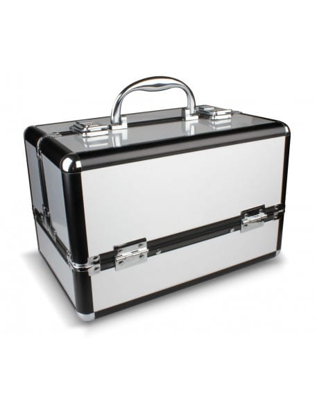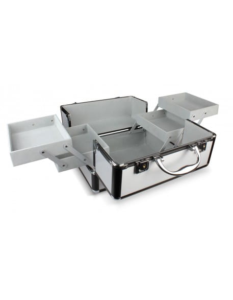 Srebrny kuferek z czarnymi narożnikami to połączenie elegancji, trwałości i wygody, które sprawdzi się zarówno w pracy salonowej, jak i mobilnej.
