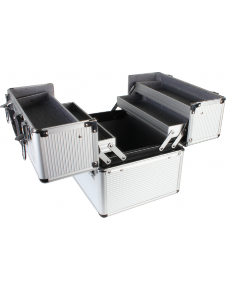Kuferek oferuje przestronną komorę, która pomieści lakiery, pędzelki, pilniki i inne niezbędne produkty kosmetyczne. Aluminiowa konstrukcja chroni zawartość przed uszkodzeniami i nadaje elegancki, profesjonalny wygląd.