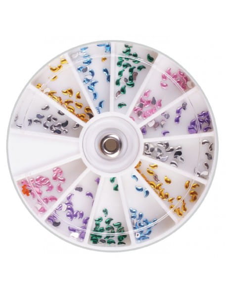 Ozdoby szklane na paznokcie. Karuzelka zawiera po 20szt ozdób z każdego koloru: różowe - 60szt, fioletowe - 60szt, srebrne - 60szt, niebieskie, zielone, żółte.